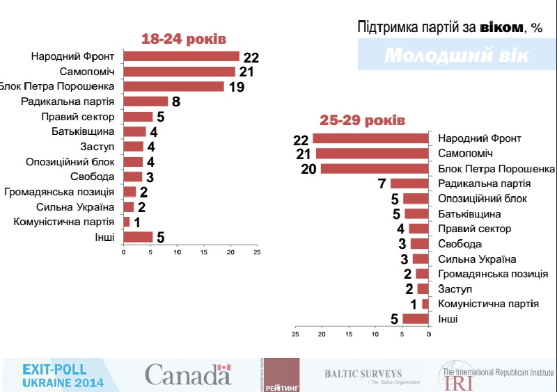 Так, 22% украинцев в возрастной группе 18-24 лет проголосовали за "Народный фронт", 21% - за "Самопомич", 19% - за партию "Блок Петра Порошенко". Похожая "картина" в возрастной группе 25-29 лет: 22%, 21%, 20% соответственно. В Возрастной группе 30-39 на первом месте тоже "Народный фронт", за него отдали свои голоса 23% избирателей. Однако на втором месте здесь президентская партия (22%), "Самопомич" - получила 20% голосов.