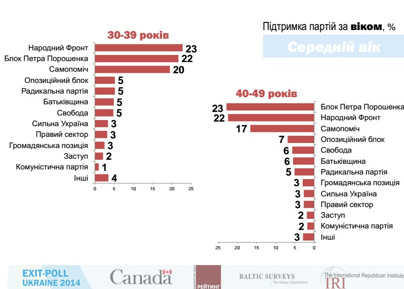 По данным Международного экзит-полла, наибольшая поддержка у партии "Блок Петра Порошенко" среди украинцев в возрасте от 40 и старше.