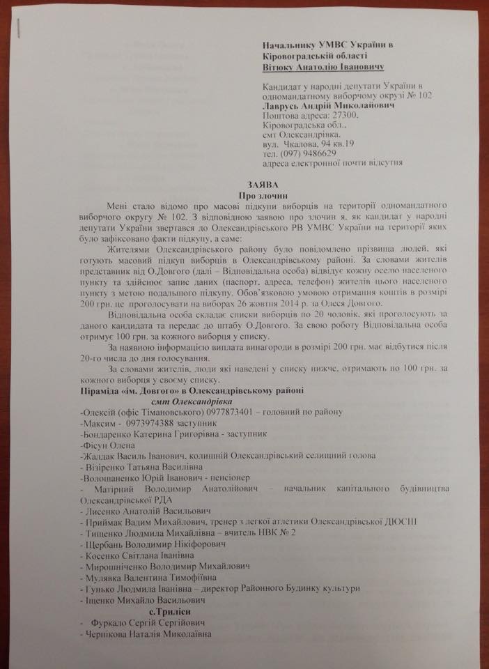 "За три дня пребывания в 102 округе наши активисты и волонтеры собрали информацию о пирамиде подкупа штаба Олеся Довгого. Схема работает так: представитель штаба посещает дома и квартиры жителей округа, собирает паспортные данные и за 200 грн подписывает соглашения о голосовании за Довгого. За каждый такой голос представитель получает 100 грн. Наши активисты на местах составили список лиц и структуру пирамиды в округе", - написал он в Facebook.