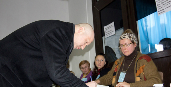Глава Компартии Украины Петр Симоненко проголосовал на ул. Лейпцигской, 1, на том же участке, что Олег Ляшко и Арсений Яценюк.