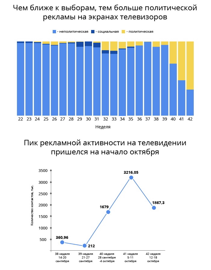 Также в исследование указывается на тот факт, что в середине октября количество политической рекламы в эфире всеукраинских телеканалов превысило количество неполитической, а социальные ролики практически полностью исчезли с экранов.
