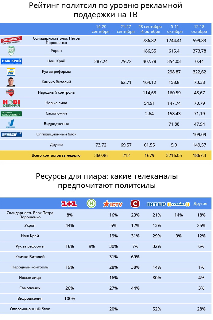 Практически все политические силы используют в качестве рекламных площадок одновременно несколько всеукраинских телеканалов. Исключение оставляет партия "Відродження", которая разместила всю рекламу на "1+1".