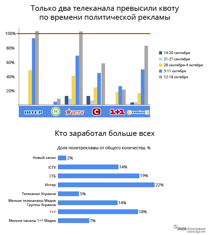 В то же время отмечается, что в середине октября каналы "Интер" и ICTV превысили временные квоты на размещение политической рекламы.