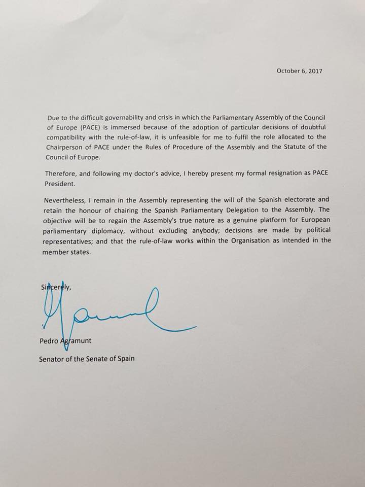 "В связи со сложным управлением и кризисом, в котором Парламентская ассамблея Совета Европы оказалась из-за принятия определенных решений, соответствие верховенству закона которых вызывает сомнения, для меня стало невозможным выполнять роль, выделенную председателю ПАСЕ согласно Правилам процедур Ассамблеи и Уставу Совета Европы. Поэтому и по совету моего врача, я формально подаю в отставку с должности президента ПАСЕ", - говорится в документе.