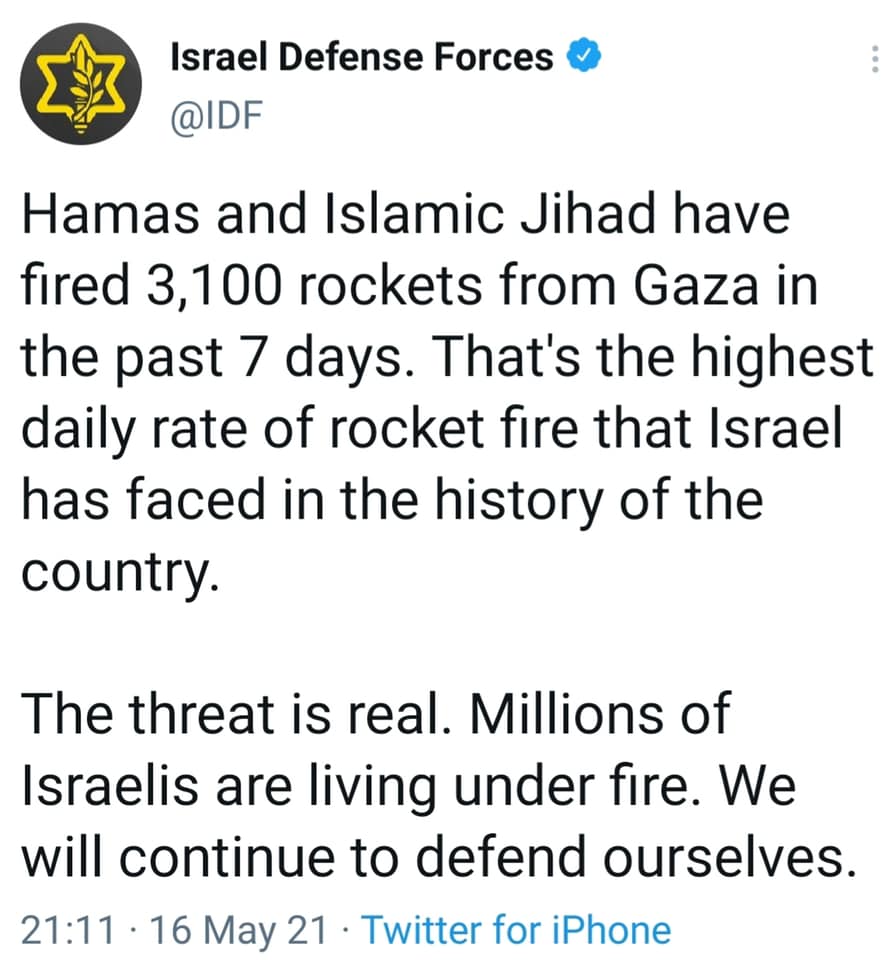 В частности, в воскресенье, 16 мая, боевики осуществили 190 ракетных запусков из сектора Газа. Каждая десятая из них упала на территории Газы, большинство остальных были перехвачены израильской системой ПВО «Железный купол».