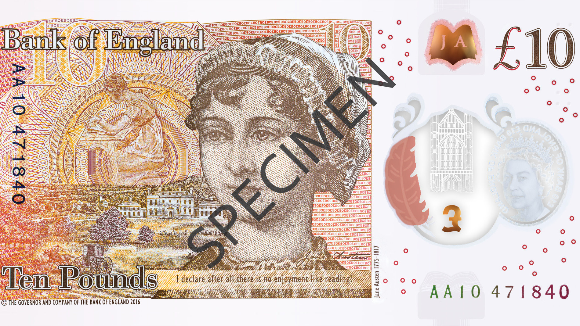Банк Англии презентовал новую банкноту номиналом в 10 фунтов стерлингов. На ее обороте изображена писательница Джейн Остин (1775 - 1817 гг) – автор известных романов, таких как "Гордость и предубеждение", "Эмма", "Чувство и чувствительность". Джейн Остин для банкноты выбрали неслучайно, ведь именно 10 фунтов получила самая выдающаяся английская писательница за публикацию своего первого произведения, сообщает 5 канал.