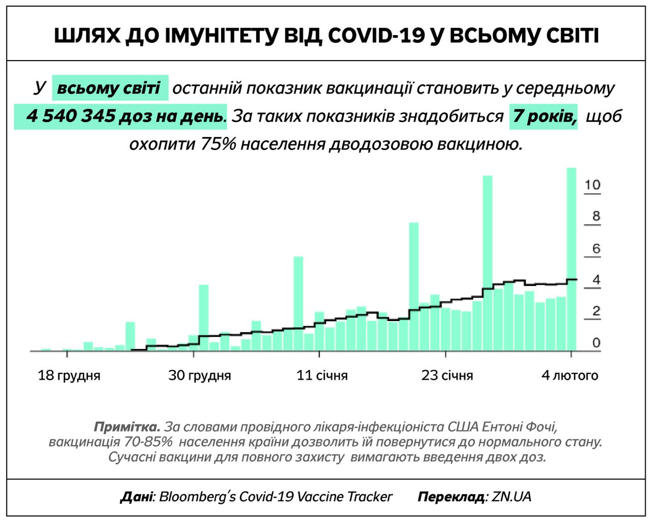 Если темпы, с которыми страны делают прививки своим гражданам против коронавирусной инфекции сегодня сохранятся в будущем, то пандемия может продолжаться еще следующие 7 лет. Об этом пишет издание Bloomberg, перевод материала публикует "Украинская правда".