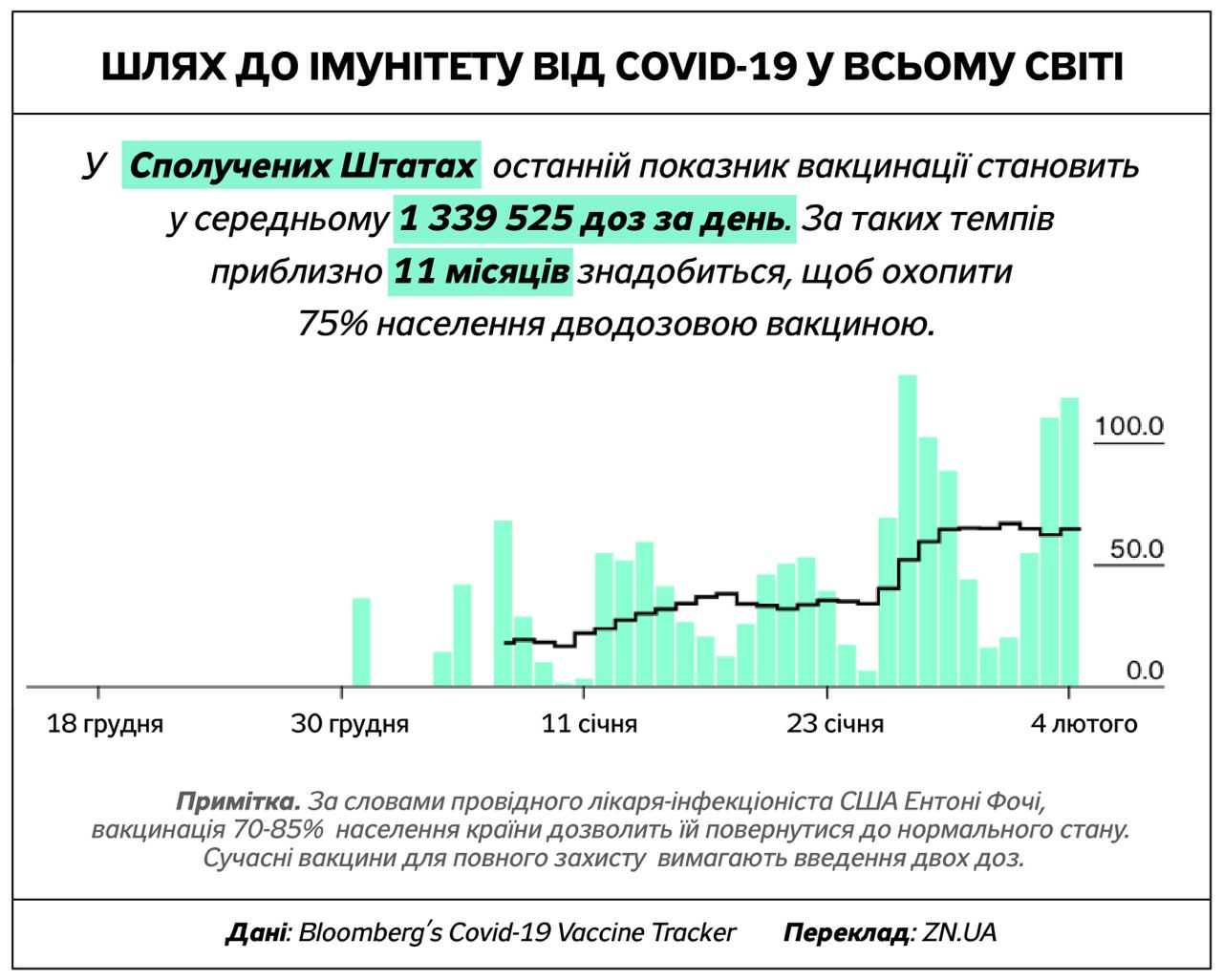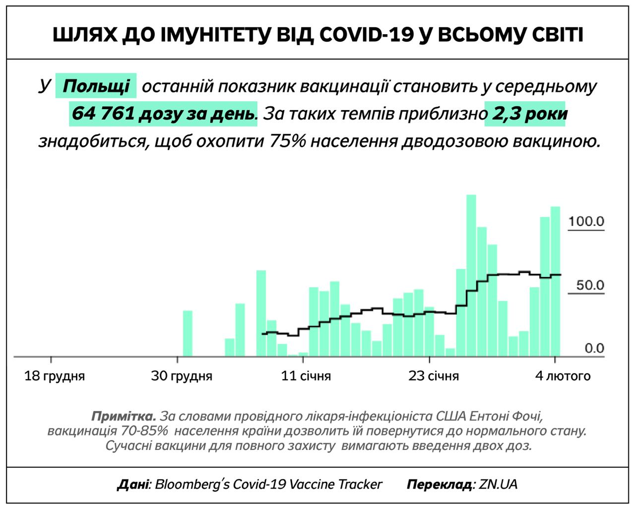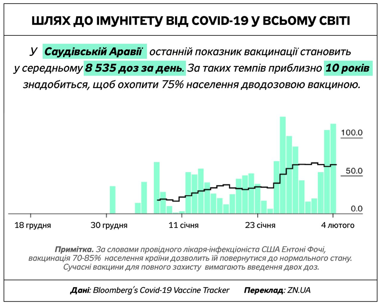 Американские ученые считают, что для того, чтобы ситуация с ковидом стабилизировалась, вакцину должны получить от 70% до 85% населения. Некоторые страны добиваются более быстрого прогресса, чем другие, нацеливаясь на 75% охват вакциной двумя дозами, о чем говорится в отчете Bloomberg Vaccine Tracker.