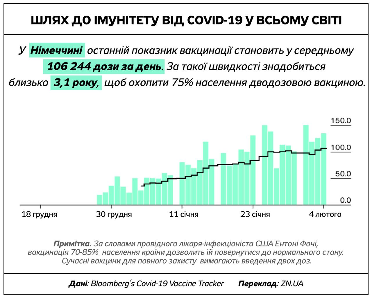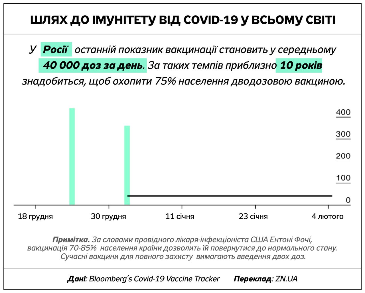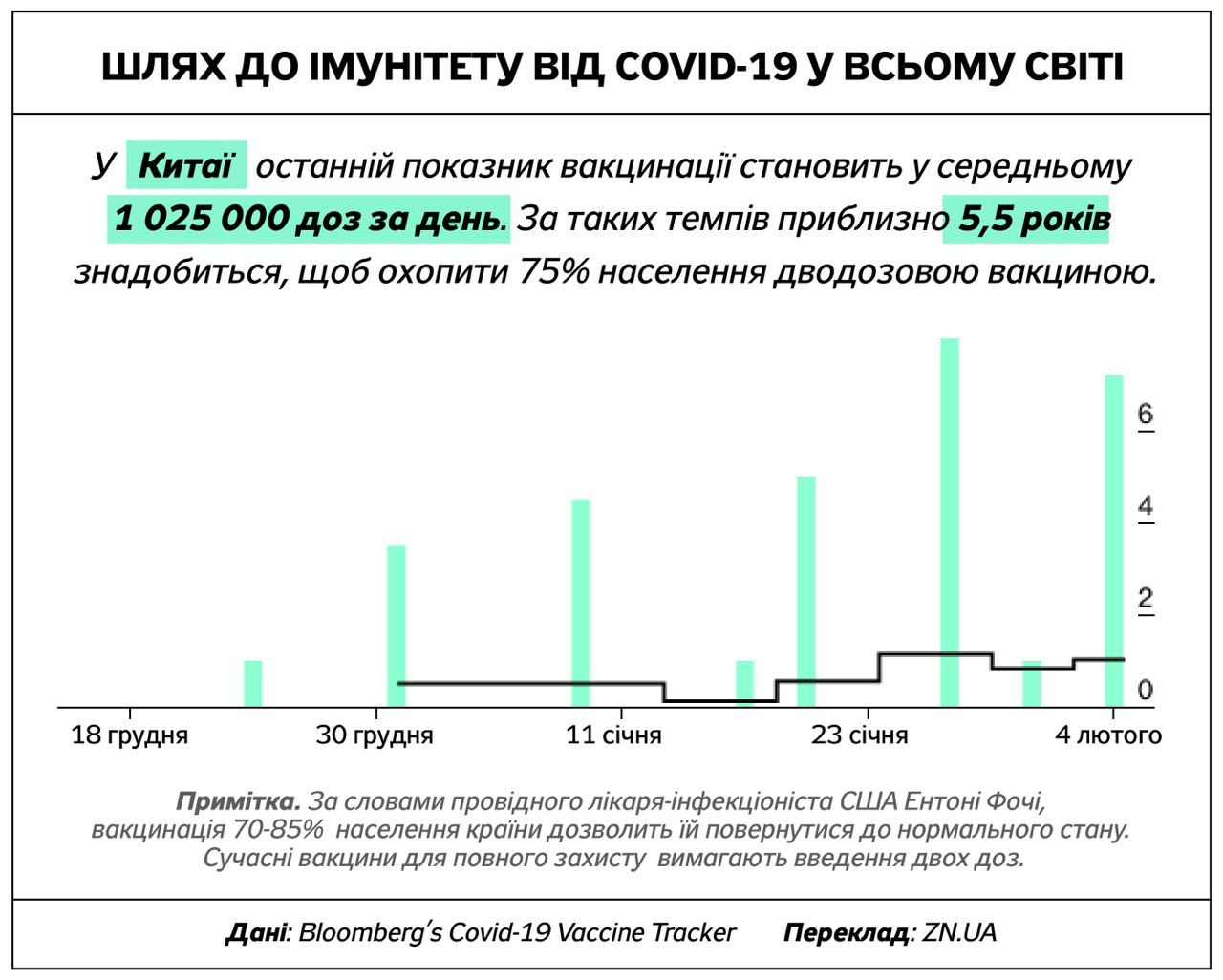Американские ученые считают, что для того, чтобы ситуация с ковидом стабилизировалась, вакцину должны получить от 70% до 85% населения. Некоторые страны добиваются более быстрого прогресса, чем другие, нацеливаясь на 75% охват вакциной двумя дозами, о чем говорится в отчете Bloomberg Vaccine Tracker.