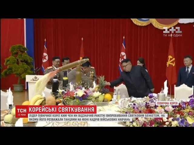 После застолья Ким Чен Ын отправился на праздничный концерт, на котором выступление танцовщиц сопровождалось видеорядом ракетных испытаний, говорится в сюжете ТСН.