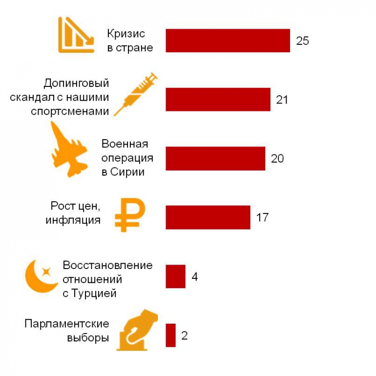 Каждый пятый респондент (21%) вспомнил о допинговом скандале с российскими спортсменами и их дисквалификации на Олимпиаде в Рио. Еще 20% опрошенных назвали событием года продолжающуюся военную операцию в Сирии. А вот такие, казалось бы, положительные события, как восстановление отношений с Турцией и выборы депутатов в Госдуму не произвели на жителей России впечатления, собрав всего 4% и 2% голосов соответственно.