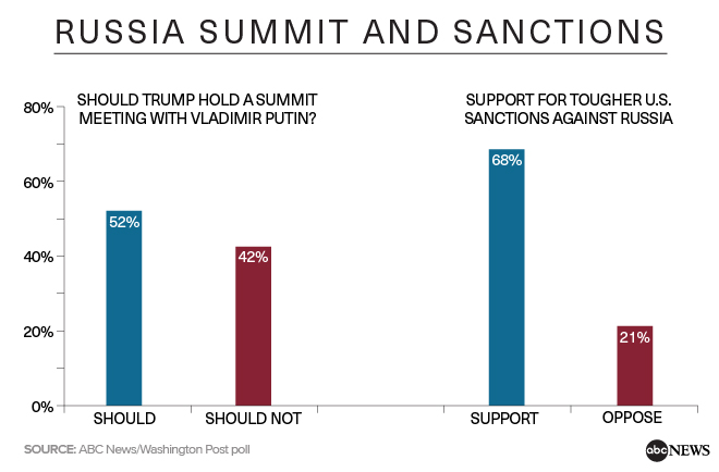 Однако 52% американцев поддерживают встречу президента США Дональда Трампа российским президентом Владимиром Путиным в Белом доме, чтобы попытаться улучшить отношения между США и Россией; 42% выступают против этого на том основании, что это легитимирует преступления Кремля.
