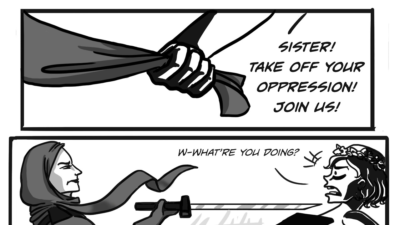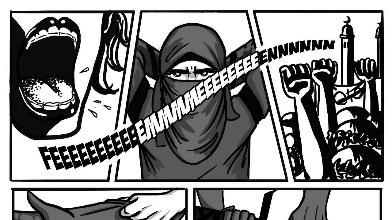 Кахира в комиксах Мохамед не приемлет методы и идеологию FEMEN, хотя с ними ее объединяет борьба за права женщин.