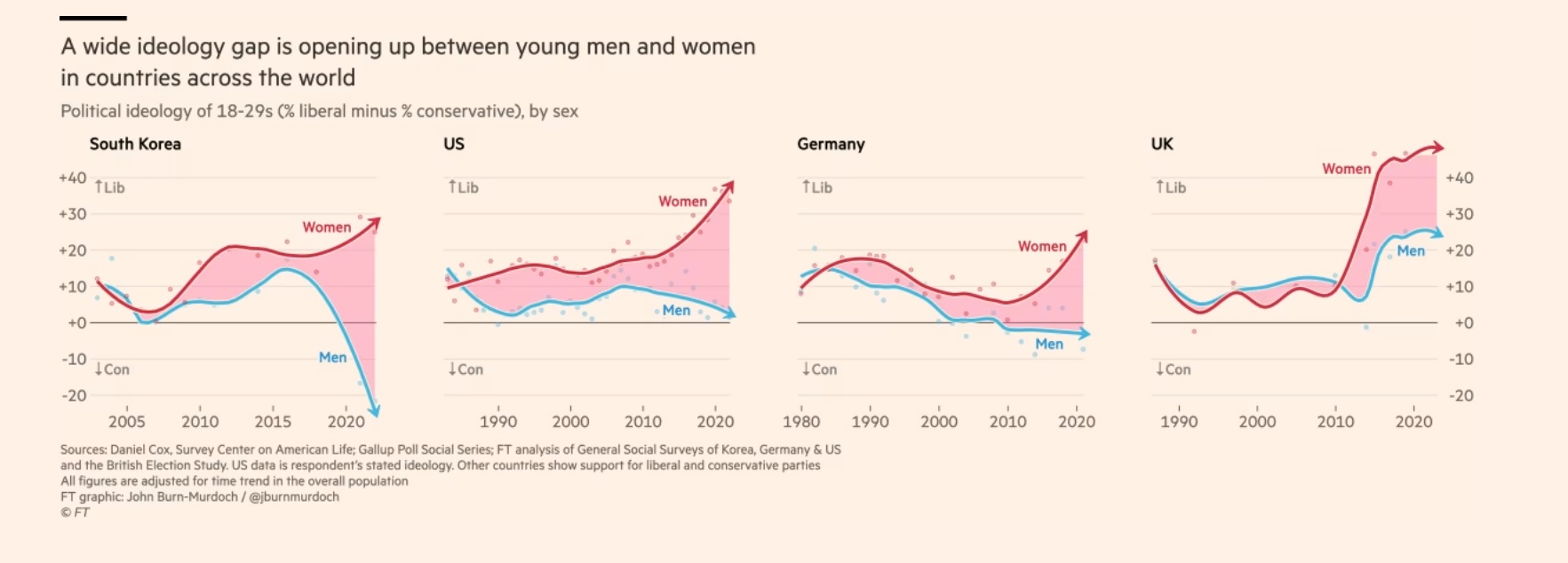 В США данные Gallup показывают, что после десятилетий, когда полы были примерно равномерно распределены между либеральными и консервативными мировоззрениями, женщины в возрасте от 18 до 30 лет теперь на 30 процентных пунктов либеральнее своих сверстников-мужчин. Этот разрыв стал гораздо заметнее в последние шесть лет. Германия также демонстрирует 30-пунктовый разрыв между все более консервативными молодыми мужчинами и их прогрессивными ровесницами, а в Великобритании этот разрыв составляет 25 баллов.