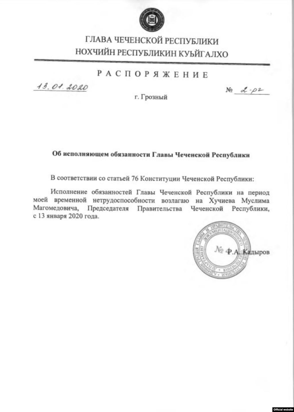 Распоряжение, подписанное Кадыровым, датировано 13 января. Согласно ст. 76 Конституции Чечни, ссылка на которую есть в документе, председатель правительства может временно исполнять обязанности главы республики по причинам, связанным с его болезнью или отпуском.