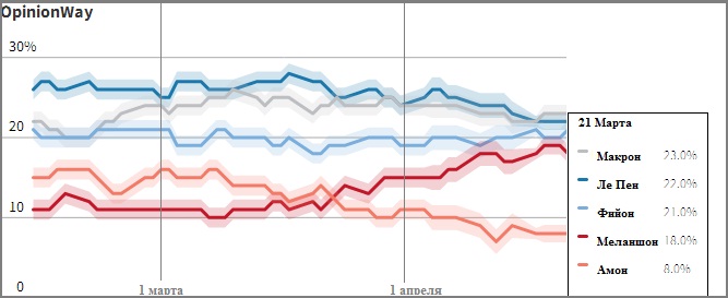Кандидатами с наивысшим рейтингом остаются центрист Эммануэль Макрон, а также ультраправая Марин Ле Пен с рейтингом 23% и 22% соответственно. На третьем месте расположился некогда фаворит Франсуа Фийон, которого сейчас поддерживают 21% избирателей. Замыкает лидирующую четверку представитель левых сил Жан-Люк Меланшон, которого поддерживают 18% избирателей.
