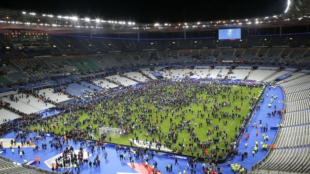 Спустя примерно полчаса после начального розыгрыша послышался первый из как минимум двух взрывов. Его было слышно внутри стадиона, и президент был немедленно эвакуирован. Взрыв в парижском пригороде Сен-Дени попал в трансляцию товарищеского матча между сборными Франции и Германии.