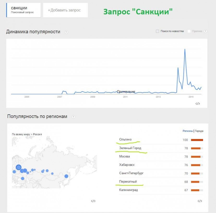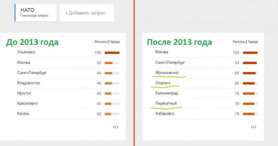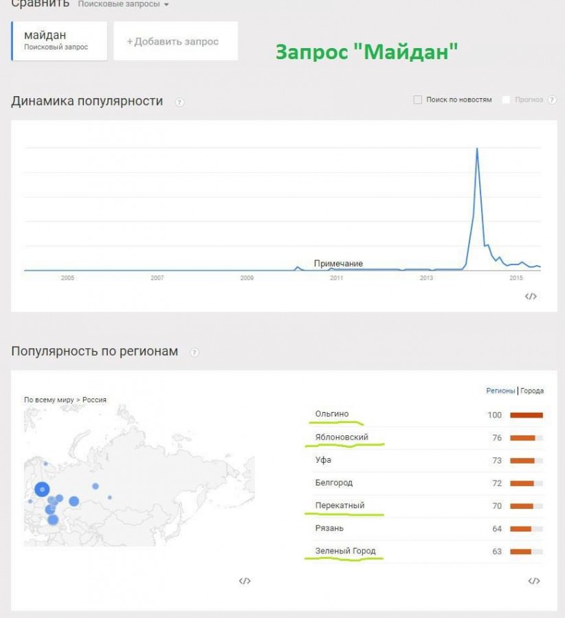 Но когда речь заходит о "громких" политических запросах, таких, как например "Майдан", "Боинг", "Референдум", "Порошенко", "Правый сектор", "Донбасс" и других, то статистика начинает удивлять. Совершенно внезапно на первые места в таких запросах выходят не города-миллионники и даже не приграничные к Украине области. Почти в любых политических запросах фигурируют маленькие поселки Ольгино, Яблоновский, Перекатный и Зеленый Город. По интенсивности запросов они иногда обгоняют даже Москву и Санкт-Петербург.