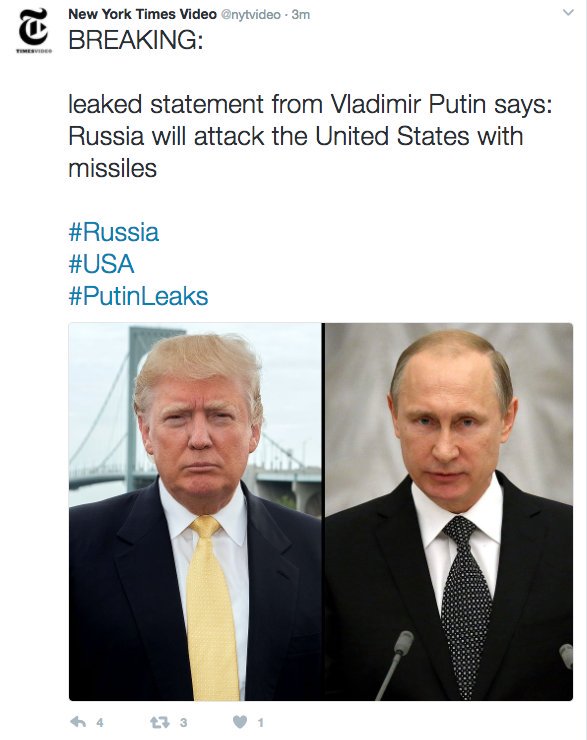 В сообщении было написано: "Срочно. Из заявления Владимира Путина следует, что Россия нанесет ракетный удар по Соединенным Штатам".