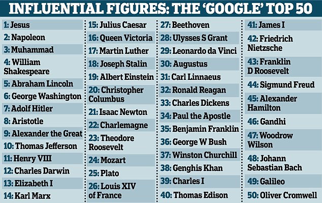 Составлен рейтинг "важности" исторических персонажей для мировой истории. Согласно данным, полученным исследователями, возглавляет список Иисус Христос. За ним следует Наполеон, на третьем месте располагается пророк Мухаммед. На четвертой позиции находится Уильям Шекспир, пятерку замыкает Авраам Линкольн.