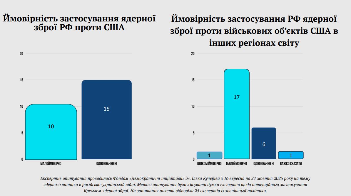 Применение Россией ядерного оружия Украины маловероятно или категорически невозможно, считают 20 из 25 экспертов по внешней политике, опрошенных Фондом "Демократические инициативы" имени Илька Кучерива. Только пять экспертов считают подобный сценарий вероятным.