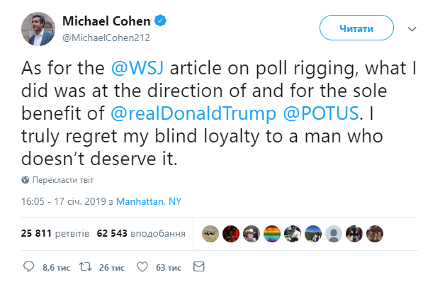 Бывший личный адвокат Трампа Майкл Коэн подтвердил, что заплатил главе небольшой технологической компании в 2015 году, чтобы подстроить данные онлайн-опросов в интересах президента США Дональда Трампа. Об этом написал в своем Twitter в ответ на публикацию издания The Wall Street Journal.