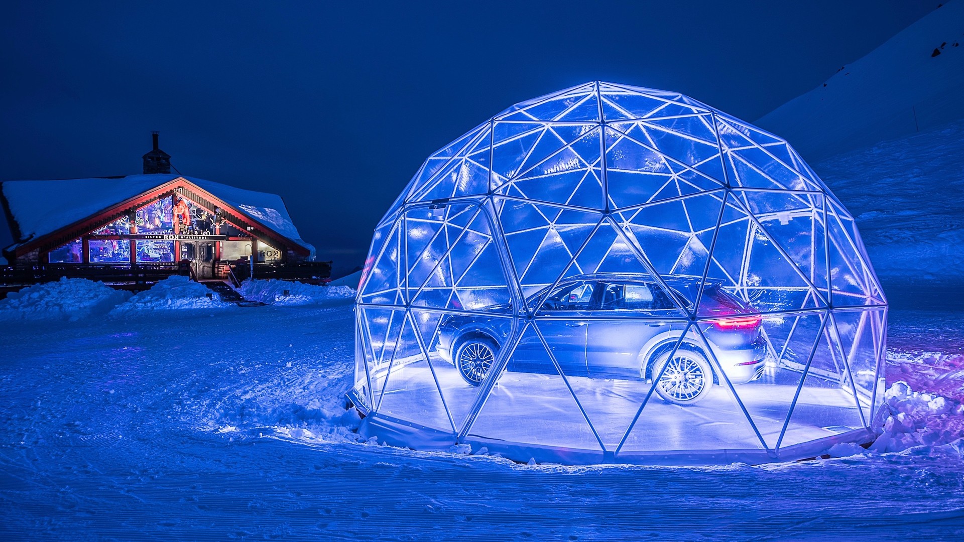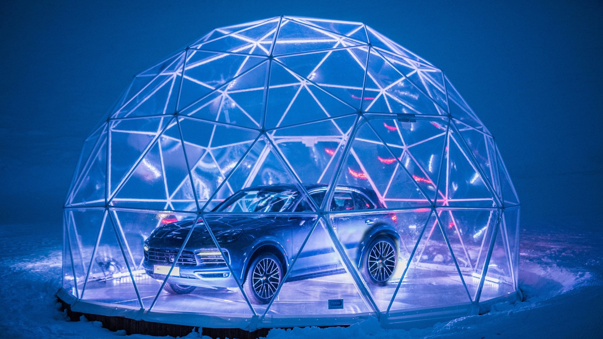 Внутри стеклянного купола выставлен Porsche Cayenne последнего поколения, который подняли на гору с помощью снегоходов. Новый "Кайен" впервые в истории модели весит менее двух тонн в базовой модификации. До 9 марта Porsche обеспечивает для всех гостей горнолыжного курорта возможность испытать модели Macan, Cayenne и Panamera Sport Turismo на специальной снежной трассе.