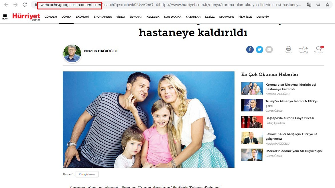 Крупнейшая газета Турции "Hürriyet" проиллюстрировала материал о том, что жена президента Украины Владимира Зеленского Елена заболела коронавирусом, его фото с поп-звездой Верой Брежневой.