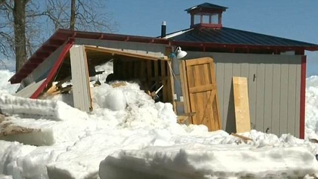Из-за сильного ветра с порывами до 90 километров в час с озера сошла огромная стена льда, высотой до 9 метров, и обрушилась на прибрежные коттеджи.