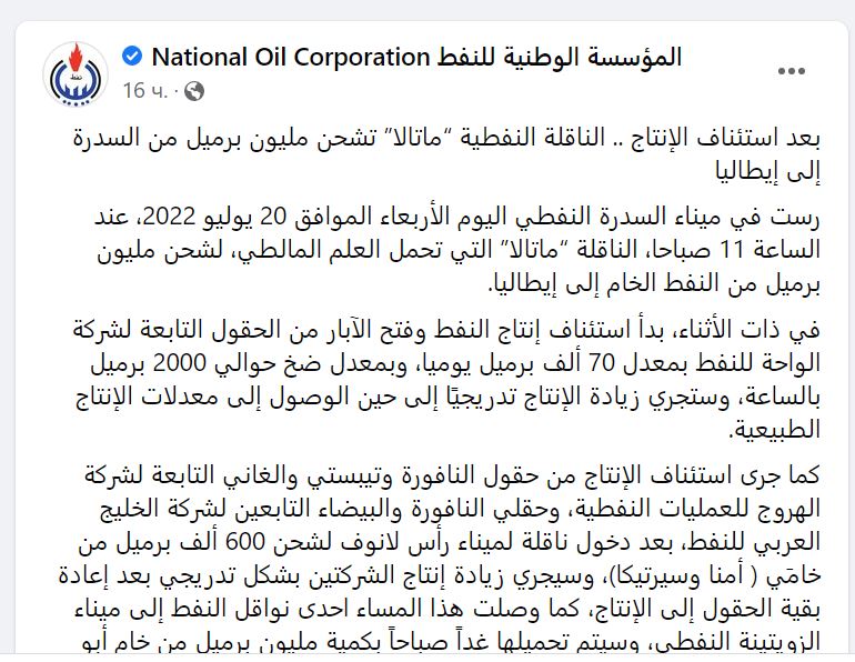В Ливии после трехмесячного перерыва возобновился экспорт нефти. Об этом сообщила Ливийская национальная нефтяная корпорация в Facebook в четверг, 21 июля.