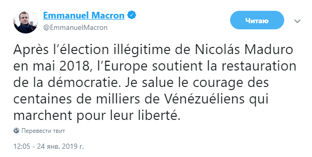 Президент Франции Эммануэль Макрон поддержал венесуэльскую оппозицию и снова назвал избрание Николаса Мадуро на должность президента Венесуэлы незаконным. Об этом он заявил на своей официальной странице в Twitter. Макрон подчеркнул, что Европа выступает за восстановление демократии в стране.