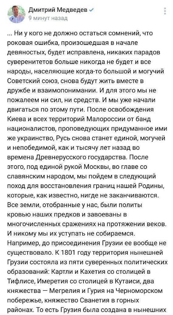 Заместитель главы Совбеза РФ Дмитрий Медведев на своей странице в социальной сети "ВКонтакте" опубликовал пост, в котором обвинил Казахстан в геноциде россиян и заявил о воссоединении СССР военным путем. Через некоторое время чиновник удалил свое сообщение, однако пользователи, успевшие его увидеть, сделали очень быстро разлетевшиеся в сети снимки с экрана.