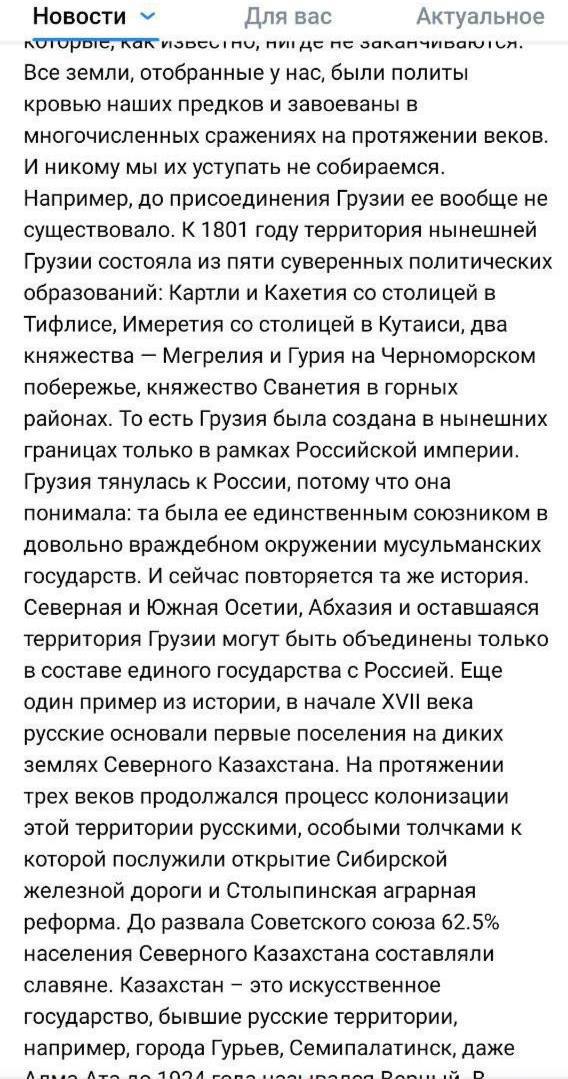 Также российский чиновник заявил, что Грузия была создана в действующих ее границах только в рамках РФ. Что касается Казахстана, то его Медведев тоже считает "искусственным государством".