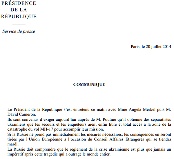 Об этом, как сообщает "Украинская правда", говорится в совместном заявлении лидеров Германии Ангелы Меркель, Великобритании Дэвида Кэмерона и Франции Франсуа Олланда по итогам телефонных переговоров.