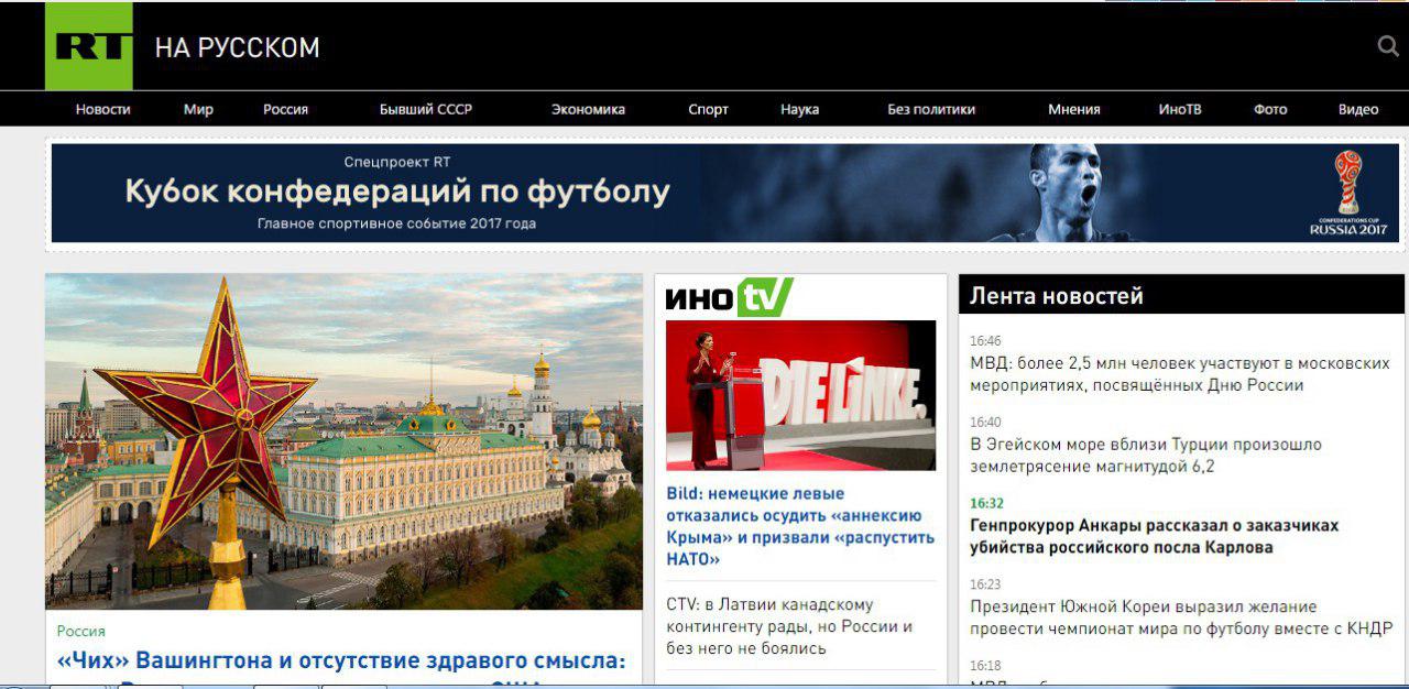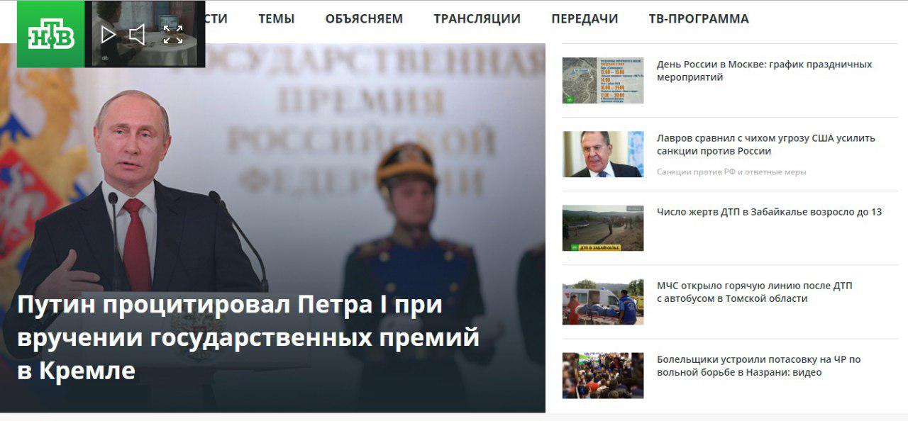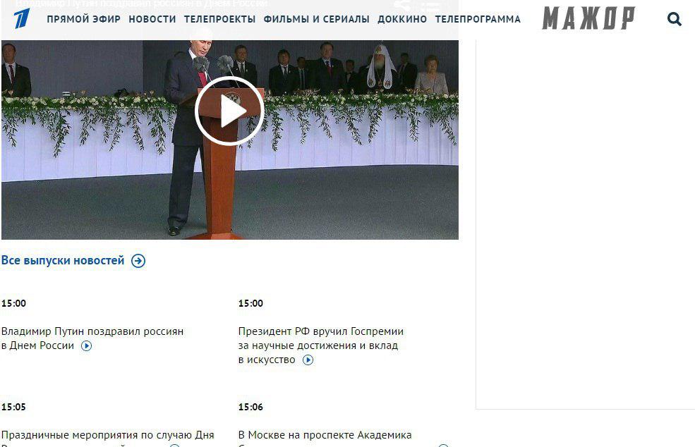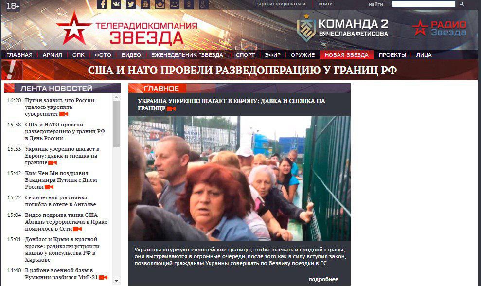 Агентство "РИА Новости" вынесло на главную страницу своего сайта новость о запрете "георгиевских ленточек" в Украине. На главной странице сайта телеканала "Звезда" закреплена новость об очередях на пограничных КПП, отделяющих Украину от стран ЕС.