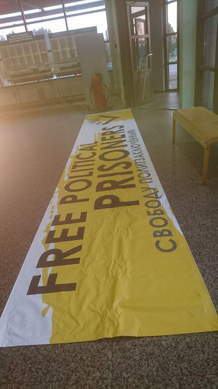 Российские правоохранители изъяли плакаты и баннер на экспертизу, а сами задержанные с 3:00 ночи удерживаются в зоне пограничного контроля, добавили активисты.