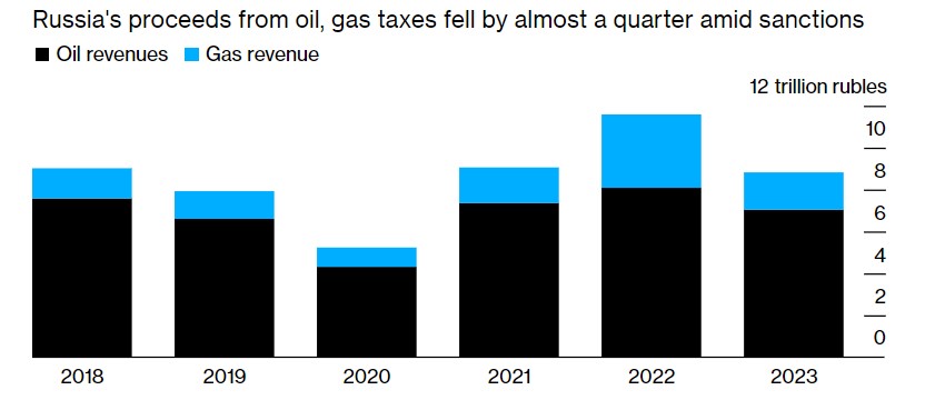 Из-за уменьшения цены на нефть и западных санкций и ограничений доходы российского бюджета от экспорта нефти и газа снизились на четверть по сравнению с 2022 годом.