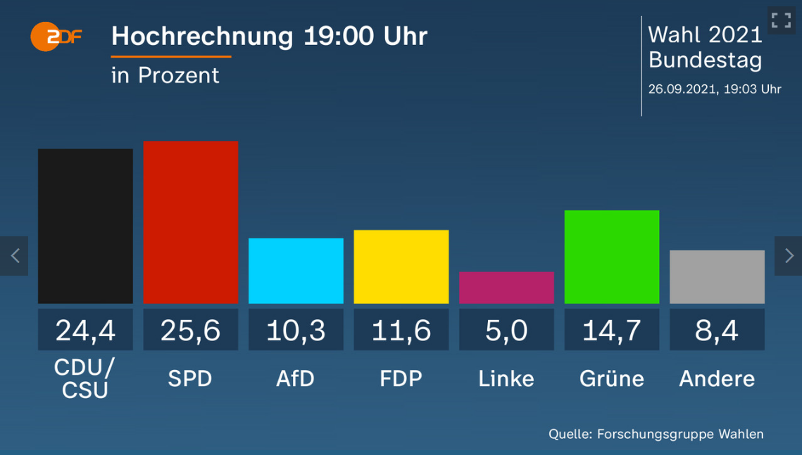 Парламентские выборы прошли в Германии в воскресенье, по предварительным итогам, побеждает “Социал-демократическая партия Германии”. “Зеленые” получили 14,8% голосов, а СвДП — 11,5%.