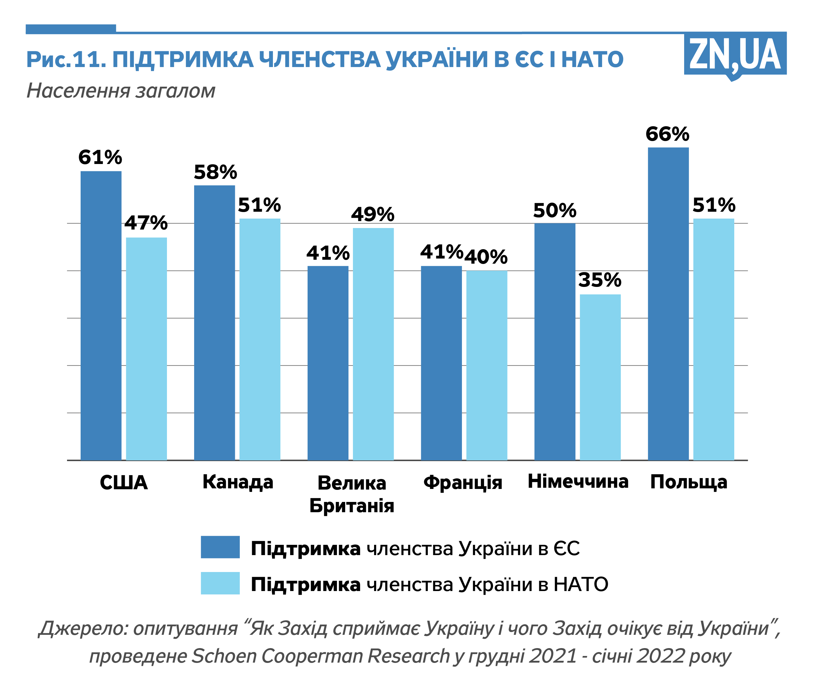 В четырех из шести стран, где проводилось исследование, — в США, Канаде, Польше и Германии поддержка населением предоставления Украине членства в ЕС в ближайшие 5–10 лет составила от 50 до 66%. Во Франции и Британии сторонников этой идеи оказалось меньше — по 41%. В случае с британцами их скепсис вполне понятен: они сами не так давно покинули ряды Евросоюза.