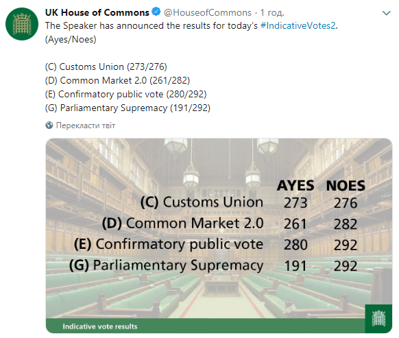 После дебатов депутаты нижней палаты отклонил все четыре варианта, результаты голосования были опубликованы в официальном Twitter Палаты общин.