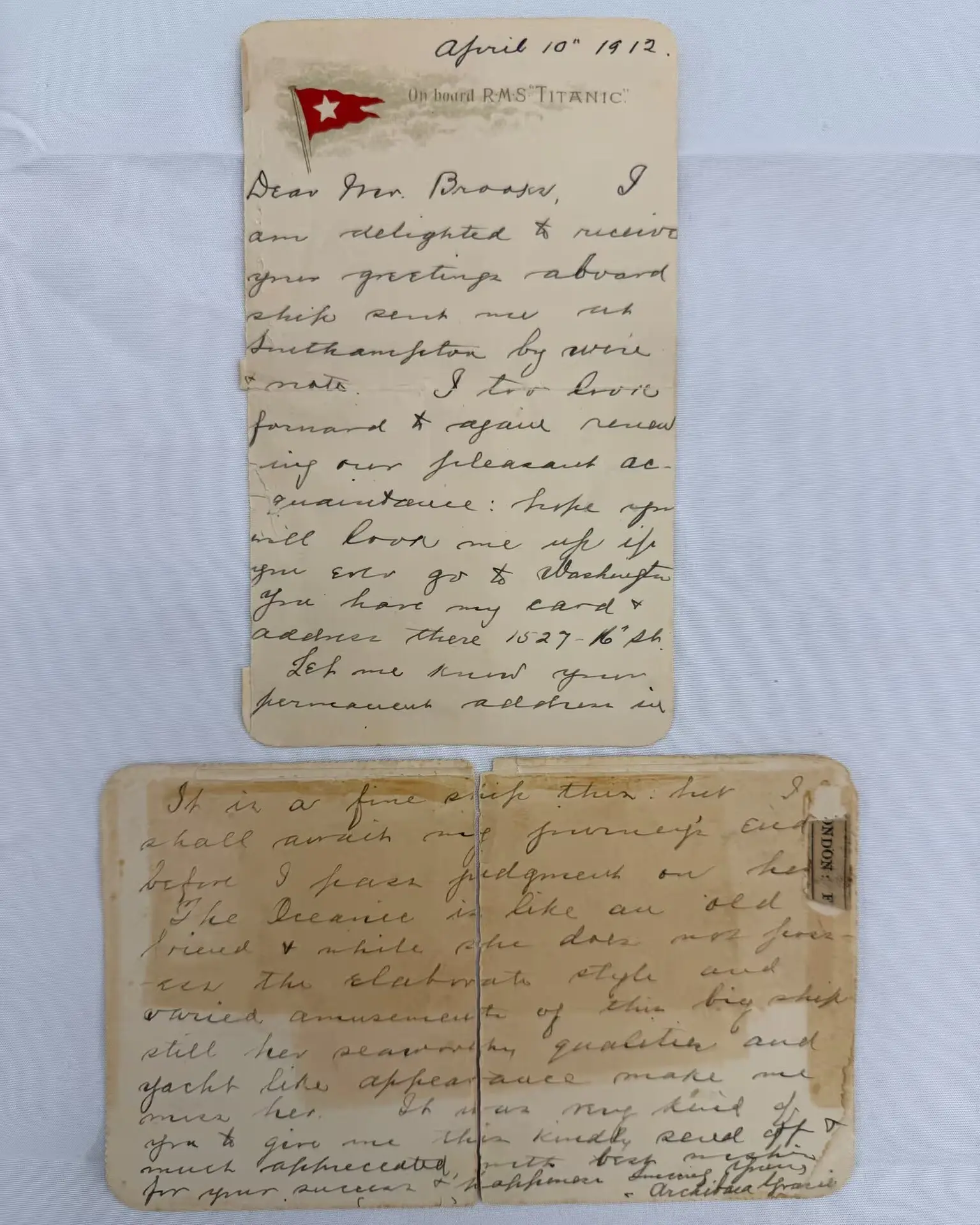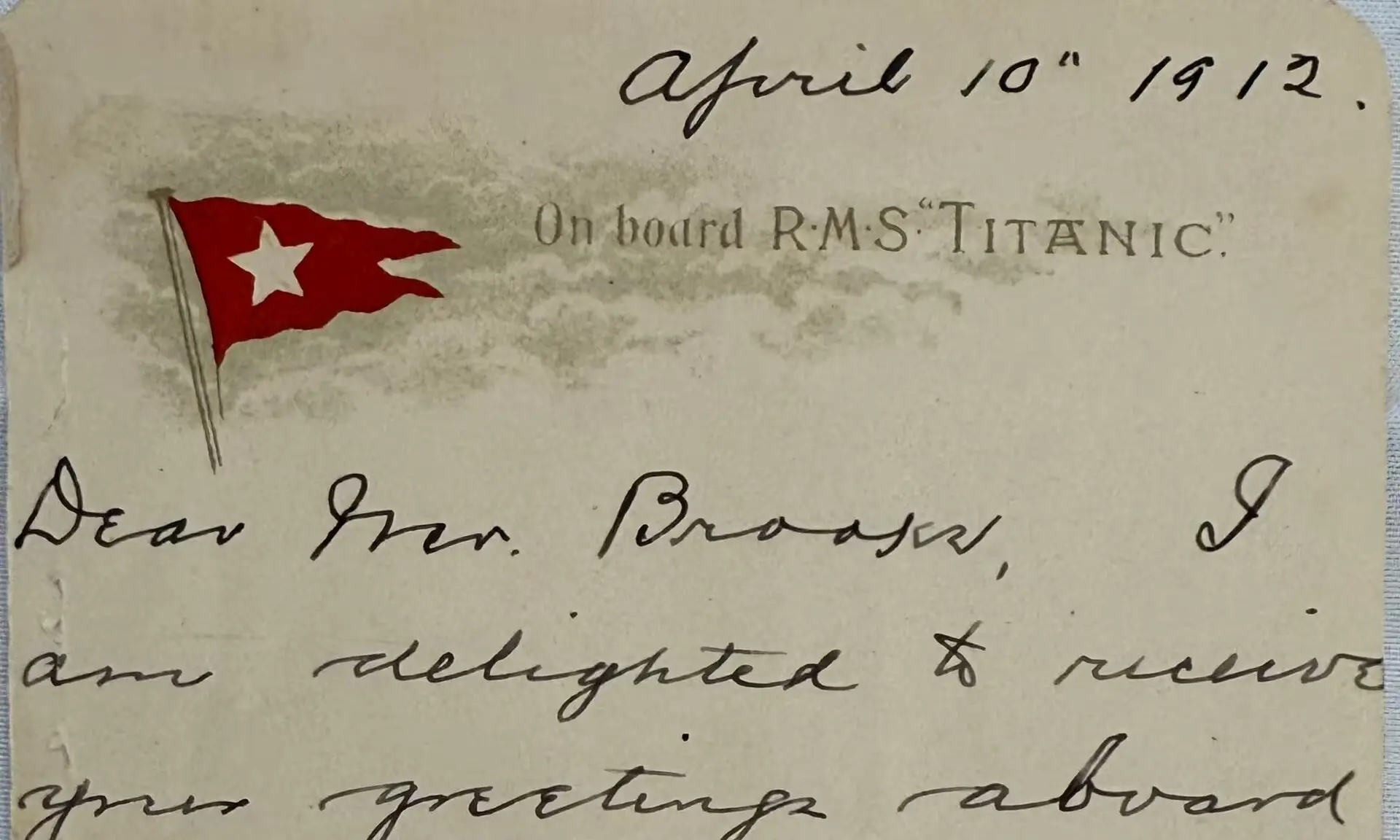Письмо-карточка датировано 10 апреля 1912 года — днем, когда он поднялся на борт, и имеет почтовые штемпели Квинстауна (11 апреля в 15:45) и Лондон (12 апреля).