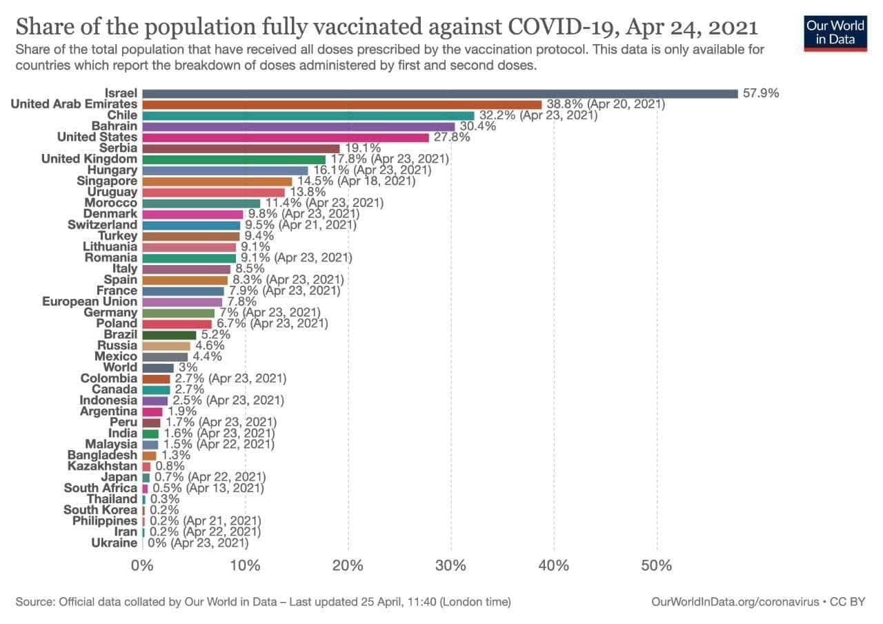США провели частичную вакцинацию почти половины своего населения, однако 91 страна провела частичную вакцинацию менее 10% своих граждан, согласно данным трекера, опубликованным газетой The New York Times с использованием цифр Our World In Data. Согласно этим данным, в Украине вакцинировали всего 1,2 человека на сотню людей. Полностью в Украине вакцинированы лишь 9 человек.