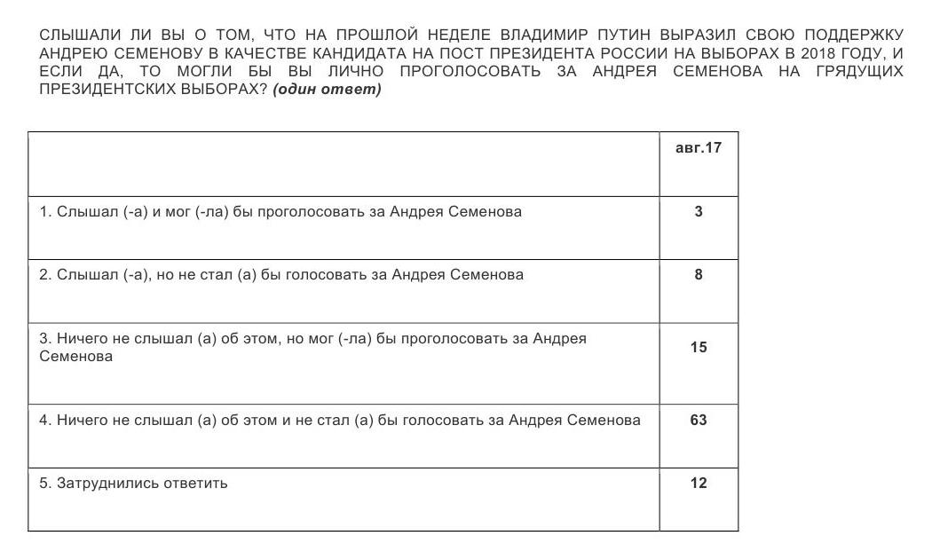 Для понимания того, насколько авторитет Путина распространяется на сферу электоральных установок жителей России, им был создан вопрос-ловушка. Для этого был придуман несуществующий политик – "Андрей Семенов", который якобы выдвигается на пост президента России на выборах в 2018 году и имеет публично продемонстрированную поддержку со стороны Путина.