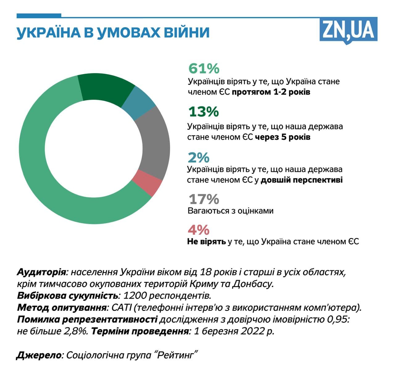 Не верят в то, что Украина станет членом ЕС лишь 4% опрошенных. По сравнению с прошлым годом количество тех, кто не верит в европейскую интеграцию Украины, значительно уменьшилось (в ноябре 2021 года таких было 26%).