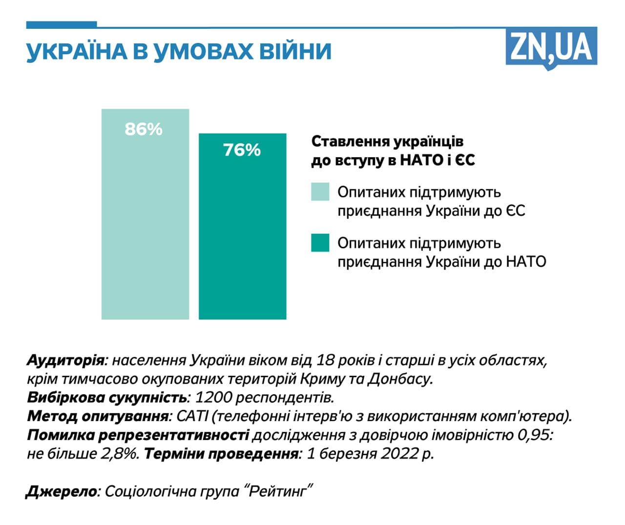 Отмечается, что 86% украинцев поддерживают присоединение Украины к ЕС, 76% - за вступление в НАТО.