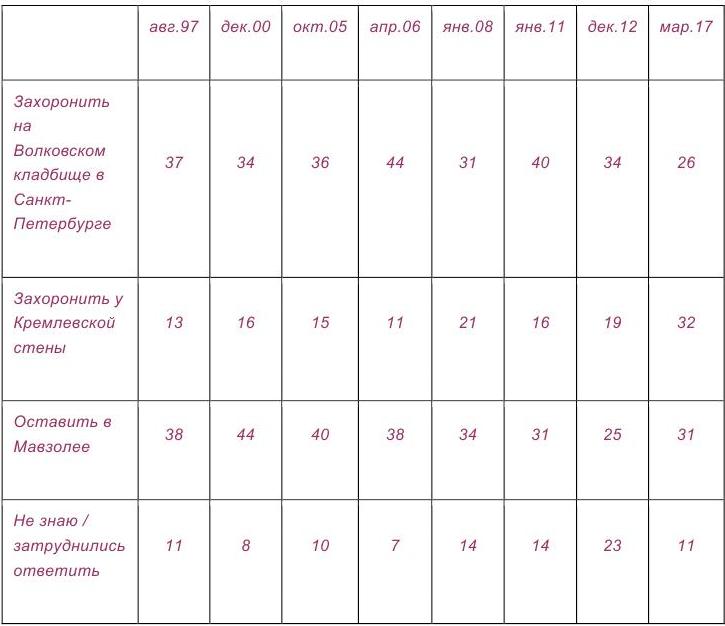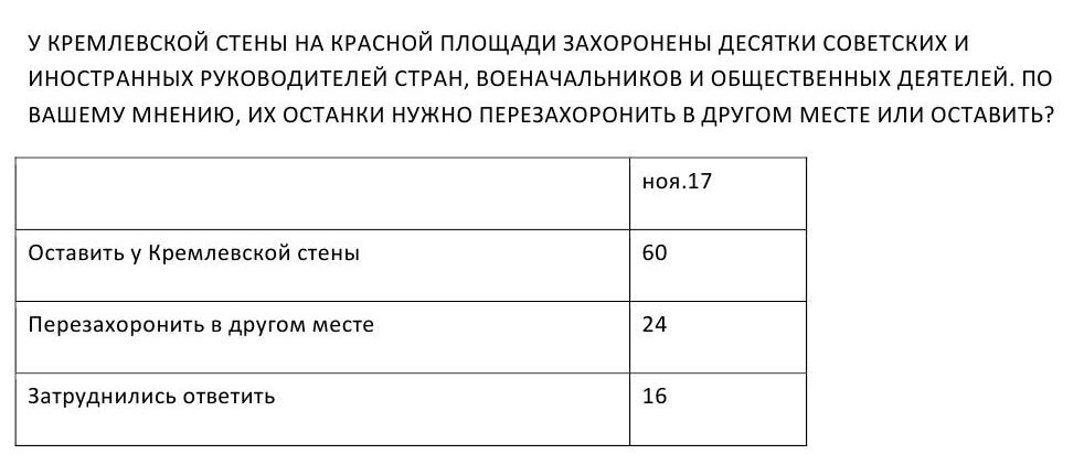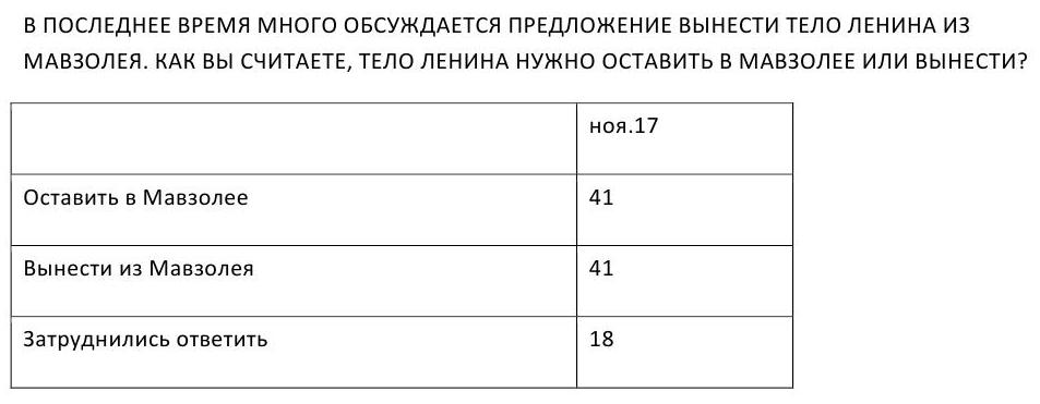 До ноября 2017 года вопрос задавался в другой формулировке и с другой шкалой: "ЧТО ВЫ ДУМАЕТЕ ПО ПОВОДУ ПРЕДЛОЖЕНИЙ ВЫНЕСТИ ТЕЛО ЛЕНИНА ИЗ МАВЗОЛЕЯ? ЕГО НУЖНО …"