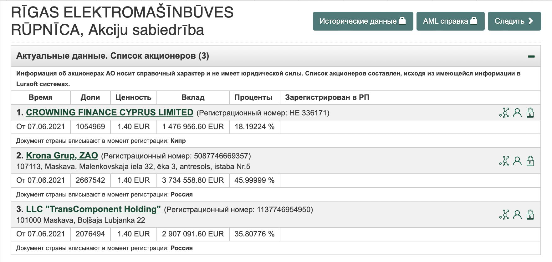 Лично и через подставных лиц олигархи контролируют приватизированный в 1990-е Рижский электромашиностроительный завод (Rīgas elektromašīnbūves rūpnīcaЮ, RER). Предприятие производит электрооборудование для поездов, вагонов метро и городского общественного транспорта.