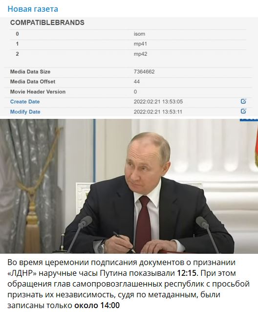 В то же время на видео, где Путин подписывает так называемый «указ» о признании «ДНР» и «ЛНР», его часы показывают 12:15.