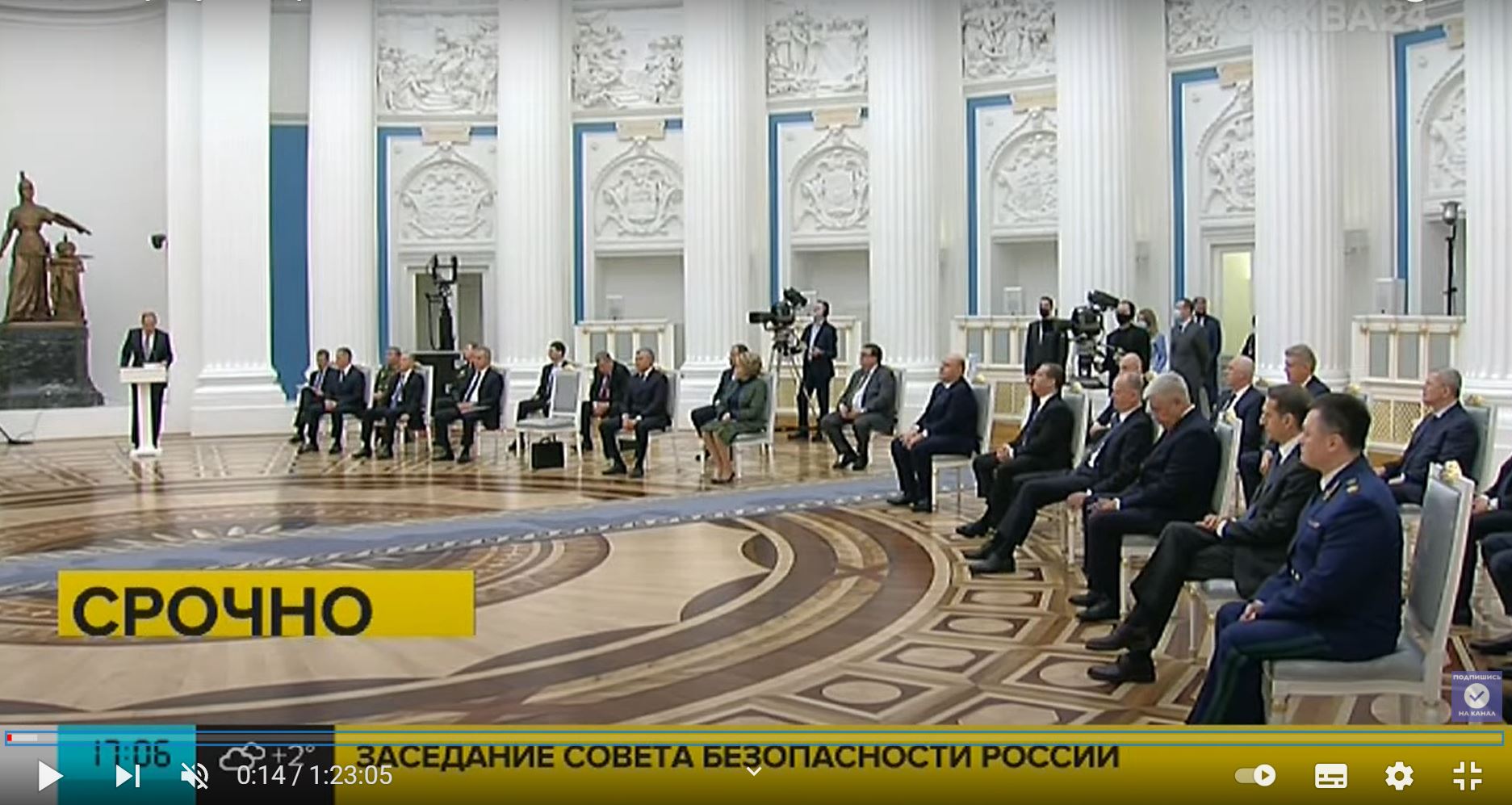 В частности, согласно видео, якобы прямая трансляция Совбеза РФ началась в 17:06 по Москве. По крайней мере, такое время было указано на самом видео.