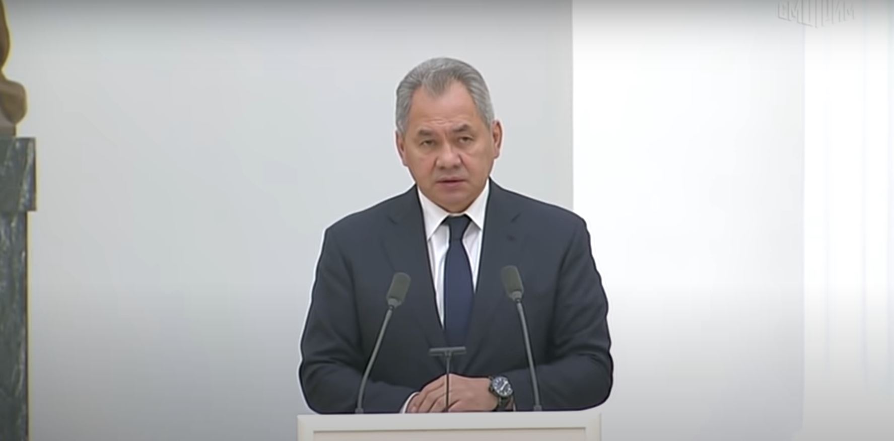 Однако во время выступления главы российского Минобороны Сергея Шойгу, выступавшего практически в конце, в кадр попали его часы, стрелки которых показывали 13:45 по Москве.